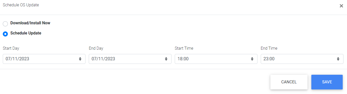 Scheduled – this is where you select the devices and date and time in which to start sending the command to download and update the operating system, it will only send the commands during the defined period on the defined dates.